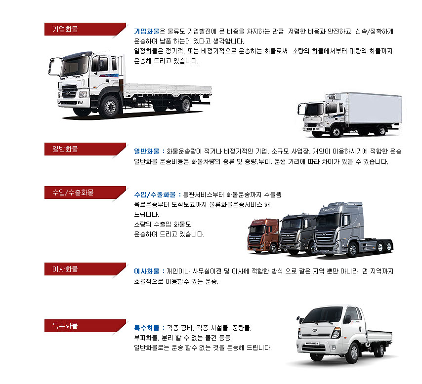 기업물류 1톤~25톤까지 다양한차종 운영, 윙바디 탑차, 전국어디든, 신속히, 안전하게, 정확히 운송 해 드립니다